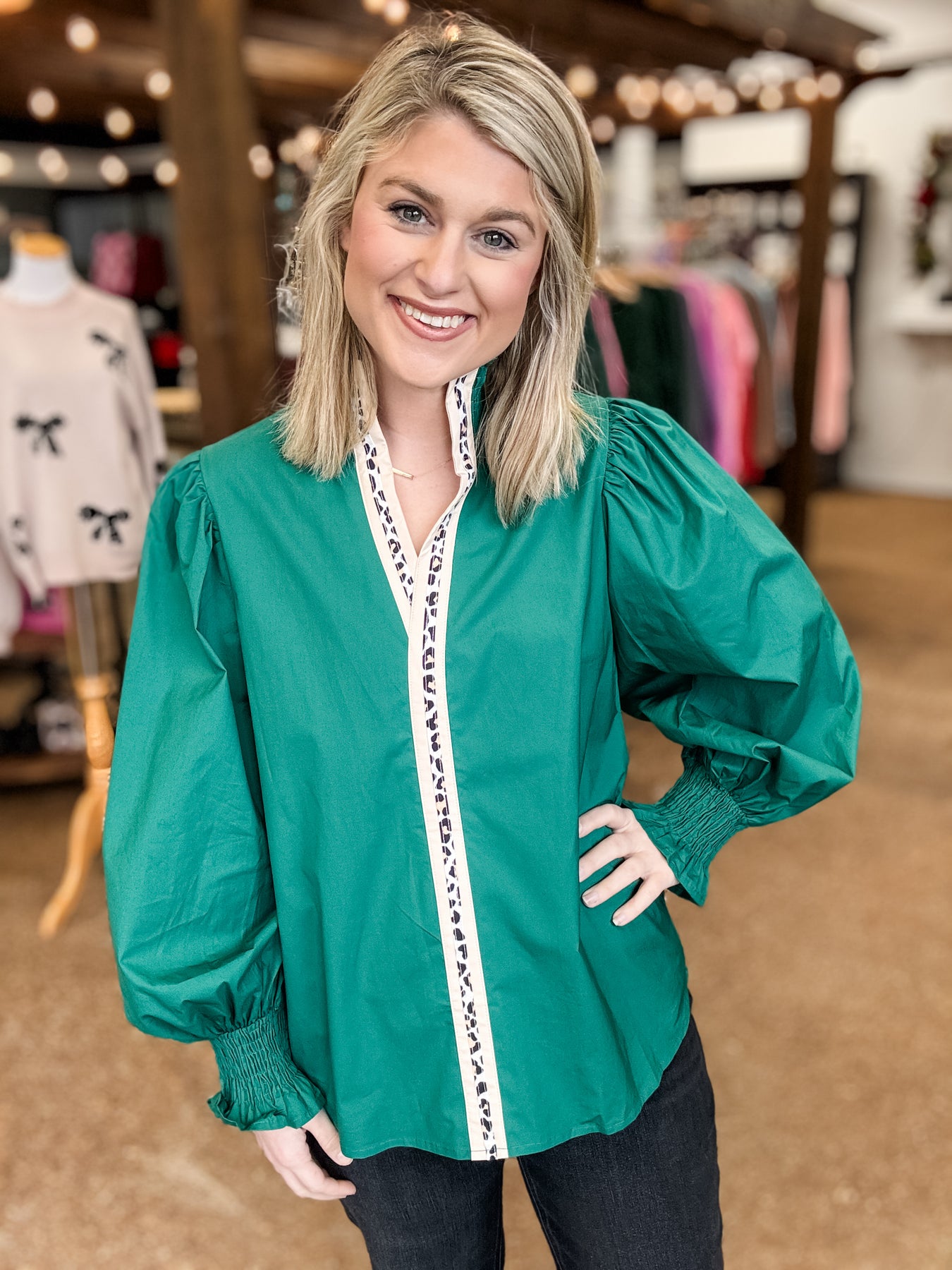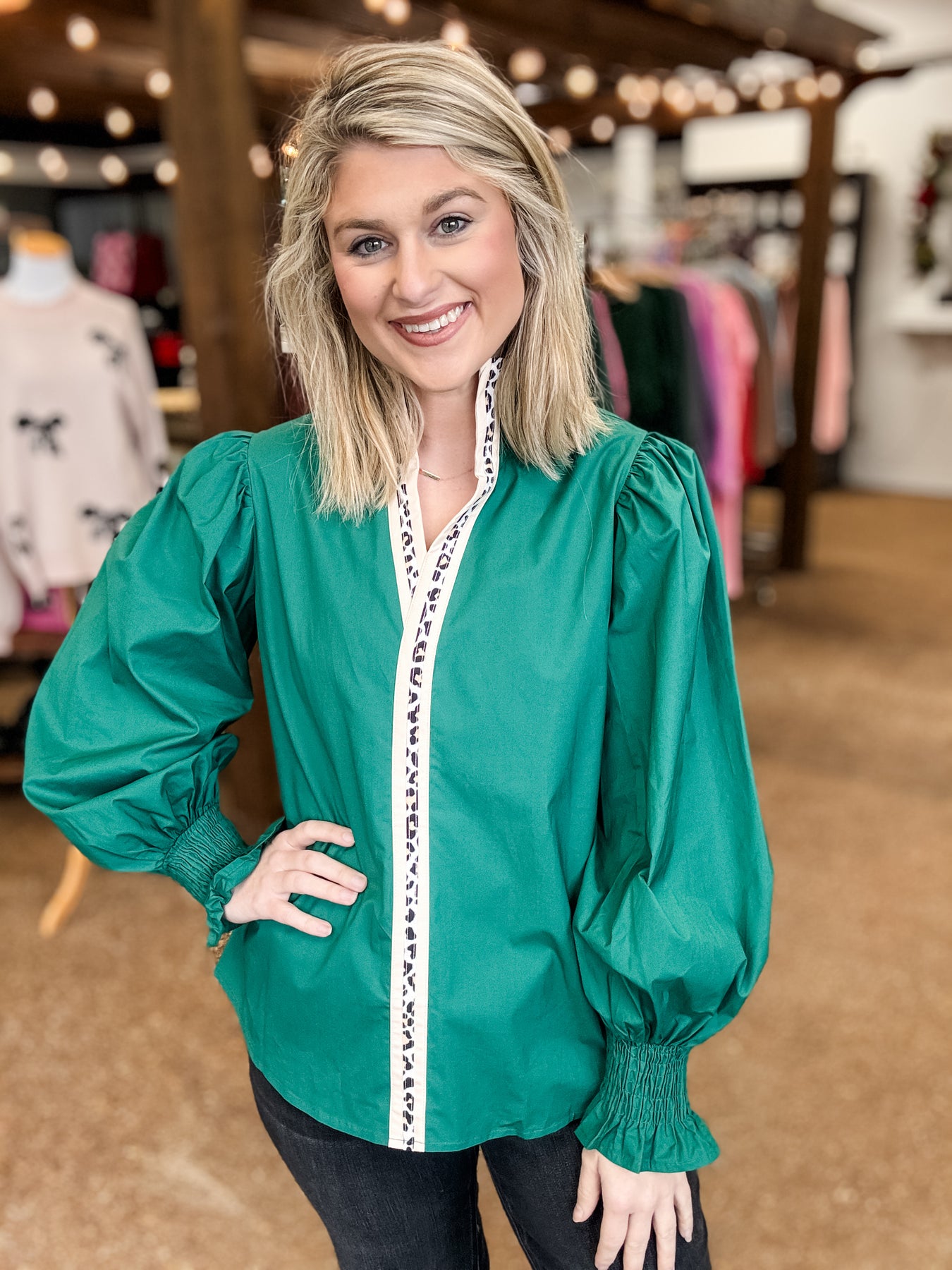 Evergreen Puffy Flounce Sleeve Leopard Trim V Neck Blouse
